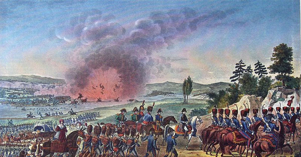Premature explosion of the bridge at the Battle of Leipzig, which stranded tens of thousands of French troops in the city, 19 October 1813. Lithograph by Carle Vernet, 19th century.
