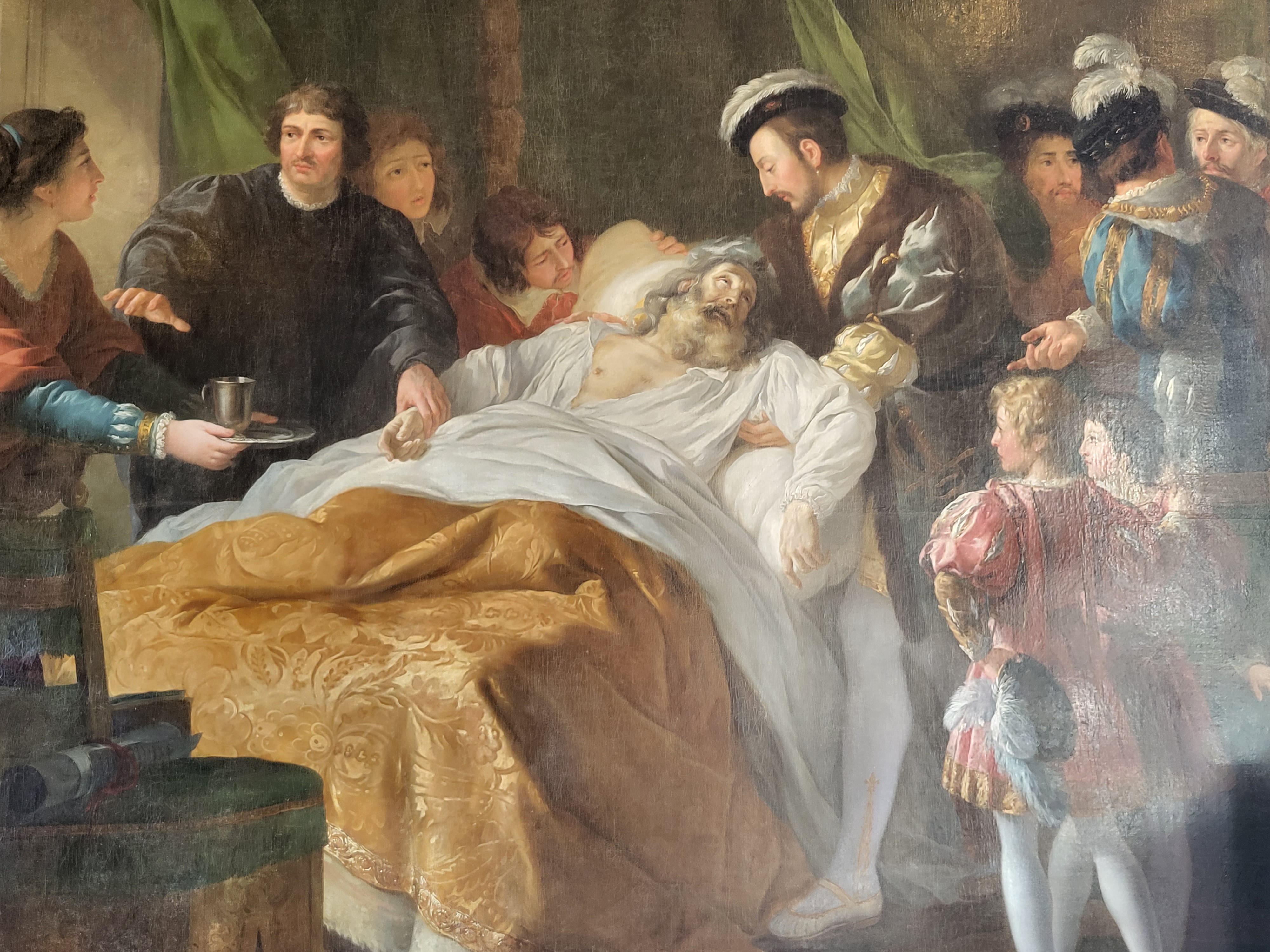 Oil on canvas by F. Ménageot, 1781, Amboise, Royal Castle, Death of Leonardo da Vinci in the arms of Francis the First. Leonardo da Vinci died at the Cloux Manor (known as the Clos-Lucé today) on 2 May 1519, in Amboise, France. To represent the king beside Leonardo, Ménageot drew his inspiration from the famous portrait of the monarch by Titian today in the Louvre museum.