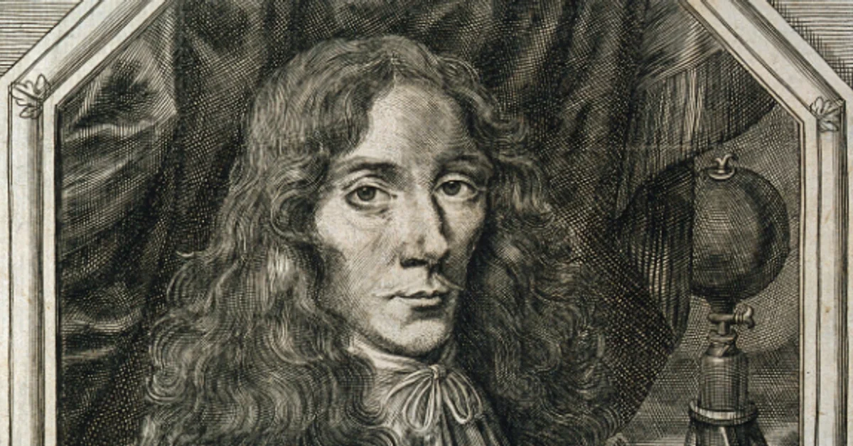 An engraving portrait of Robert Boyle (1627-1691), the Anglo-Irish chemist, physicist, and experimental philosopher. In the background is the scientist's celebrated air pump.