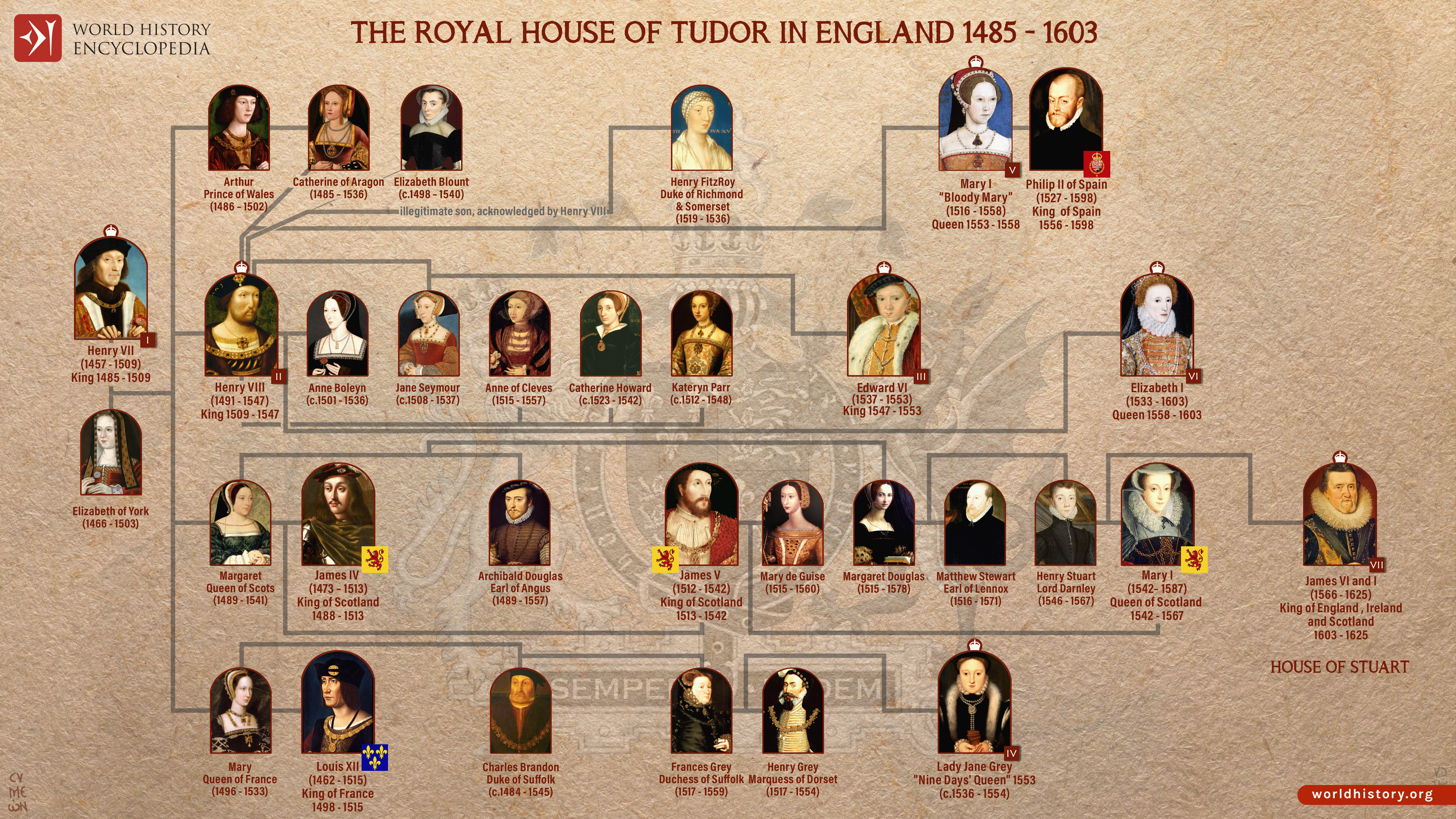 An infographic illustrating the genealogy and royal succession of the House of Tudor that held the throne of England and its realms from 1485 to 1603. With predominantly Welsh origins in the male line, the dynasty descended from the Tudors of Penmynydd and Catherine of Valois (a daughter of Charles VI of France and mother of Henry VI) and won the crown of the Kingdom of England following Henry VII Tudor’s victory against Richard III that ended the Wars of the Roses.
