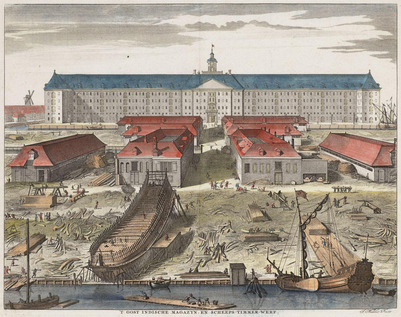 Image of the Dutch East India Company (VOC) warehouse and the shipyard in Amsterdam, the Netherlands, which would have inspired Peter on his Grand Embassy trip to Western Europe. Copper engraving coloured by hand by Joseph Mulder.