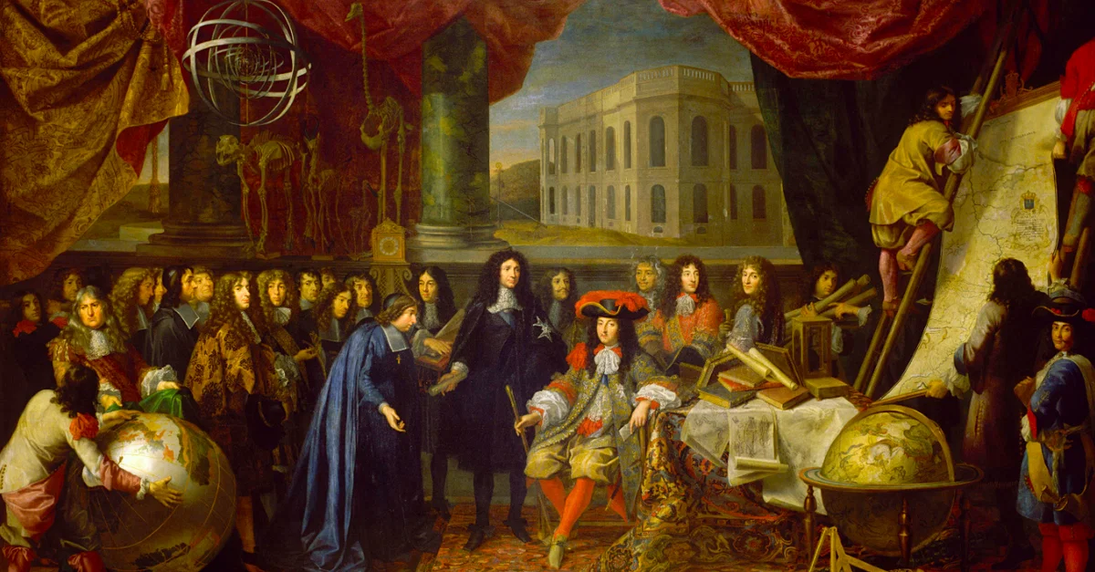 A 17th-century painting by Henri Testelin titled Establishment of the French Academy of Sciences and of Paris Observatory. Louis XIV of France (r. 1643-1715) is shown being presented the founding members of the Academy and Observatory (shown in the background) c. 1667. (Palace of Versailles)
