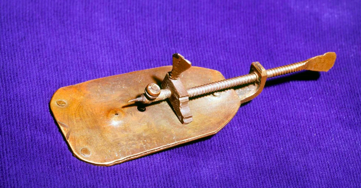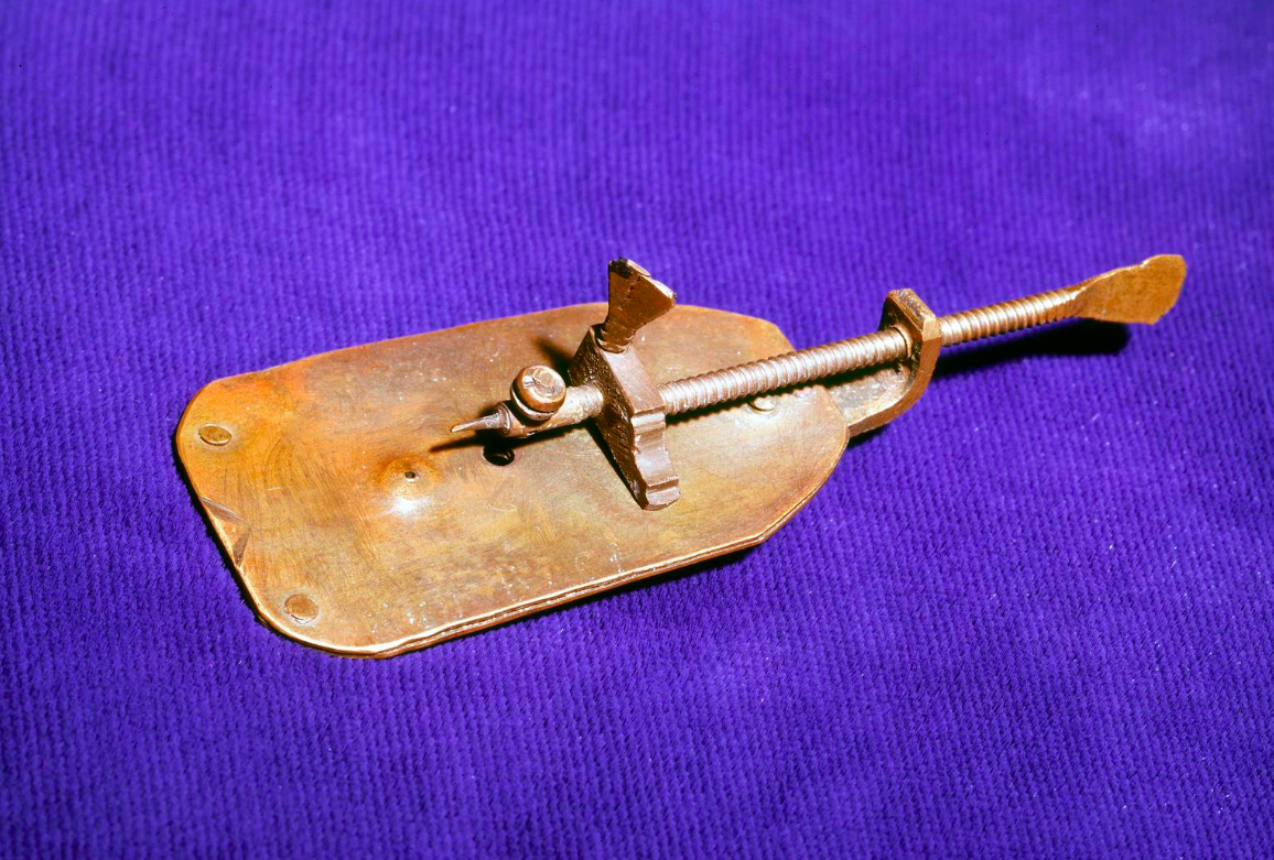 A model of a microscope designed and built by the Dutch microscopist Antonie van Leeuwenhoek (1632-1723). The device was unique as it used not the usual glass lenses but a tiny glass bea which gave a superior magnification. Measurements: 22 mm x 80 mm x 27 mm. (Science Museum, London)