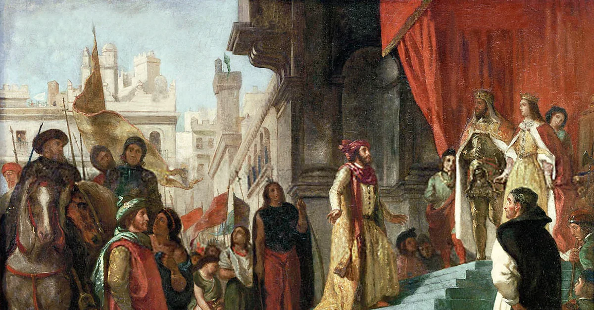 An image of Christopher Columbus (1451-1506) seeking an audience with Isabella I of Castile (1451-1504) and Ferdinand II of Aragon (1452-1516). Painted by Eugène Delacroix in 1839. Oil on Canvas. Located in the Toledo Musuem of Art in Toledo, Ohio.
