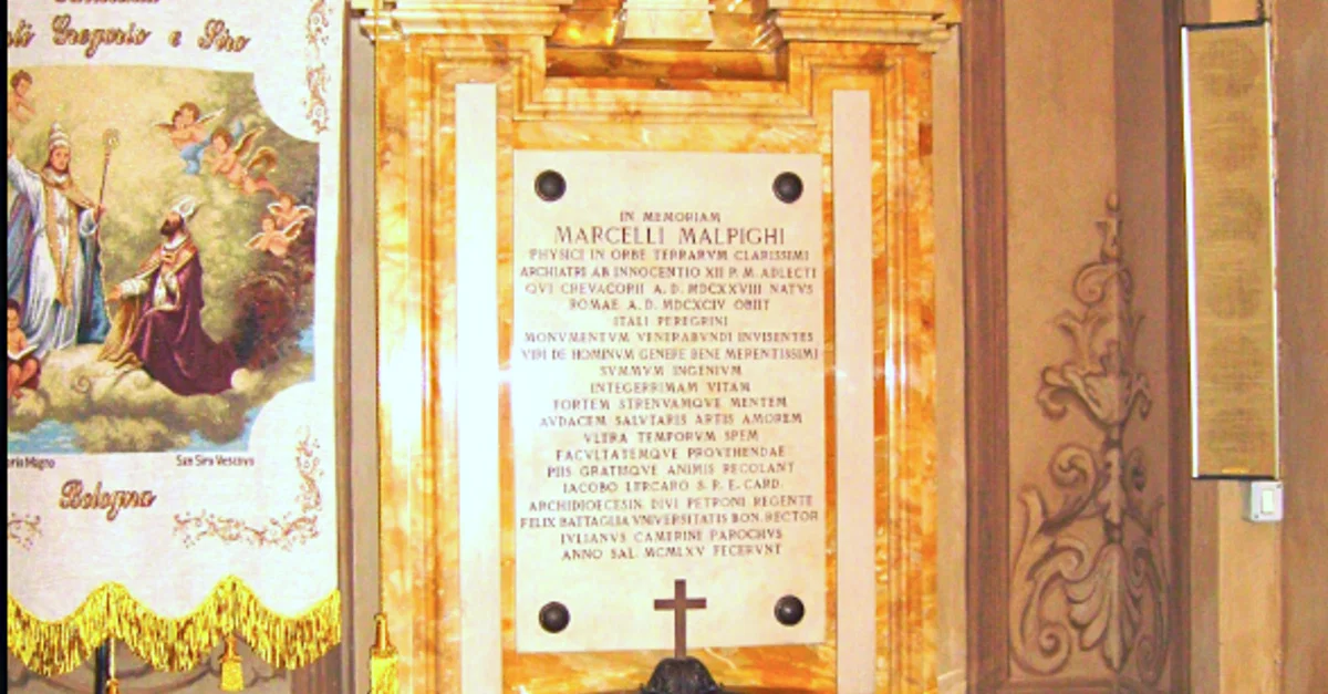 The tomb of the scientist Marcello Malpighi (1628-1694), Church of Santi Gregorio e Siro, Bologna, Italy.