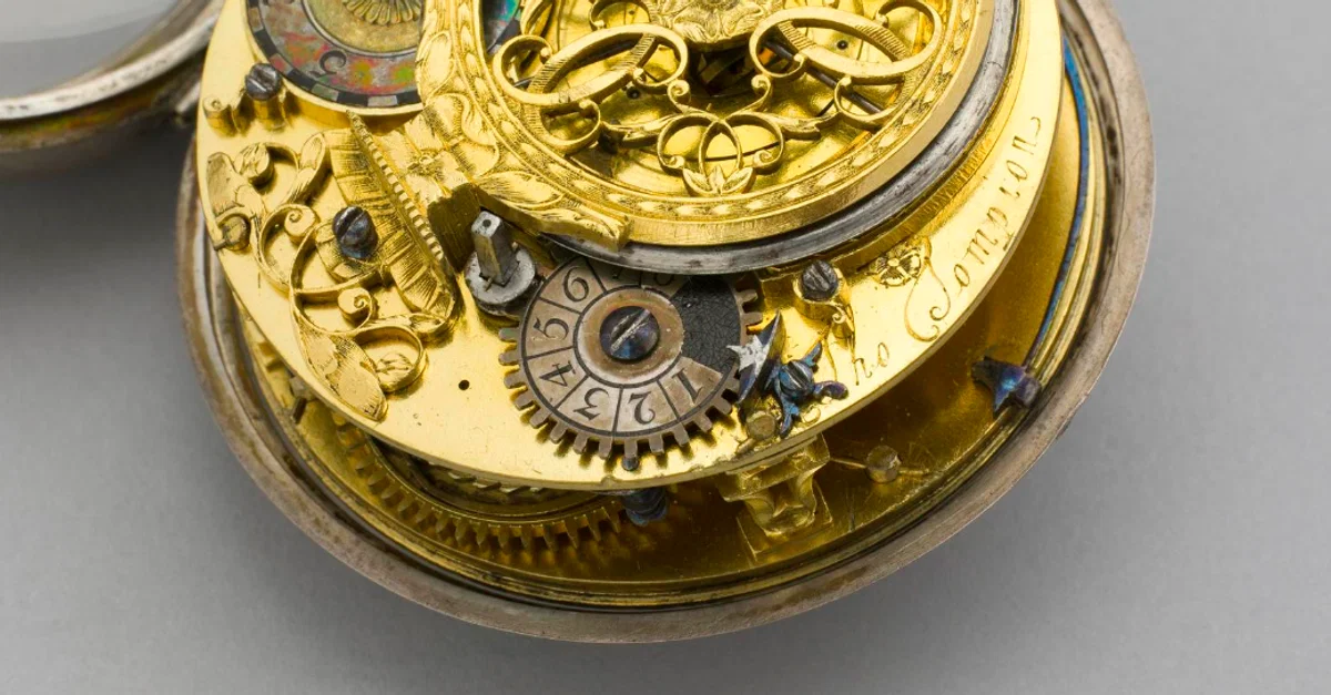 A watch mechanism using a balance spring. Made by Thomas Tompion (1639-1713). Such watches, of which this is one of the earliest surviving, greatly improved accuracy over pendulum clocks. Made between 1675 and 1679. (Science Museum, London)