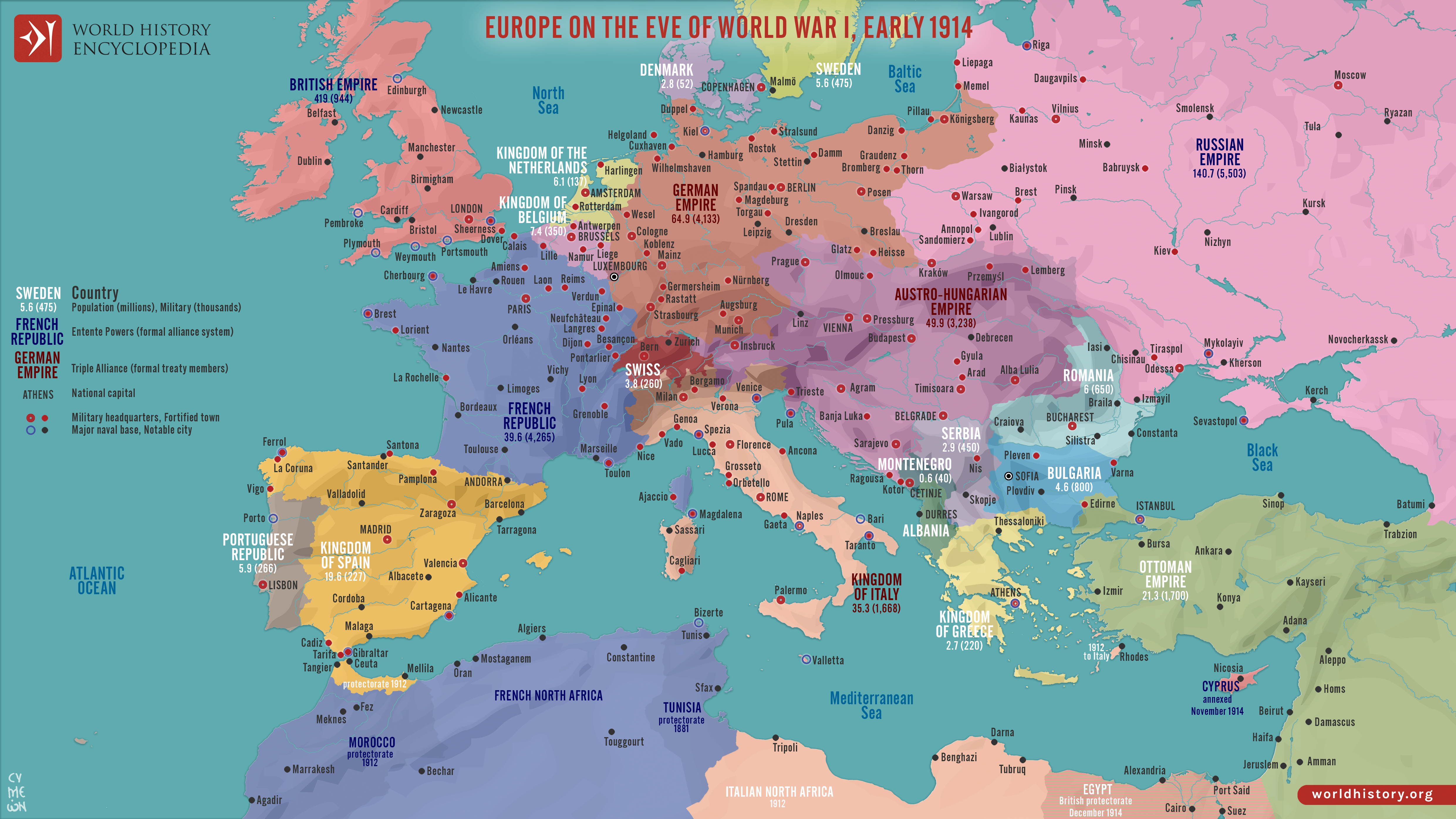 Netchev, Simeon. "Map of Europe on the Eve of World War I, Early 1914." World History Encyclopedia, January 24, 2026. https://www.worldhistory.org/image/18079/map-of-europe-on-the-eve-of-world-war-i-early-1914/.