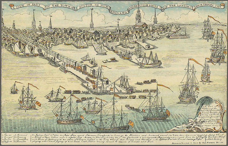 British troops disembarking from warships in Boston, Massachusetts, in 1768, an 1898 colored copy of the original 1768 engraving by Paul Revere.