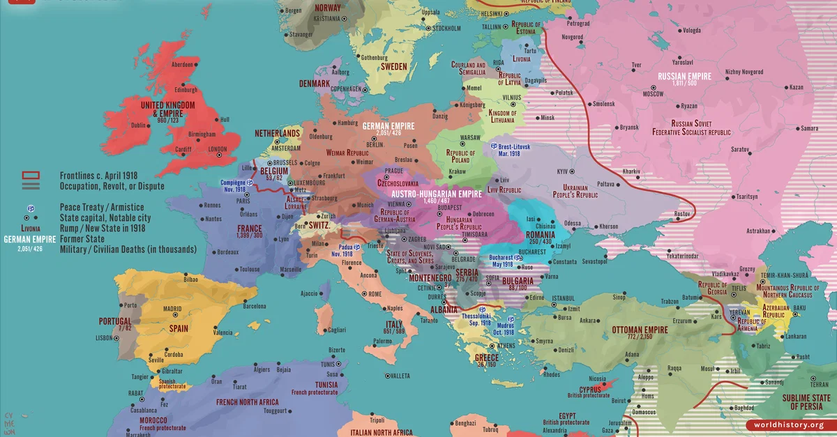 Netchev, S. (2025, November 11). Map of Europe at the End of World War One, November 1918: Lost Empires, Uncertain Borders, and New Nations. World History Encyclopedia. https://www.worldhistory.org/image/18127/map-of-europe-at-the-end-of-world-war-one-november/