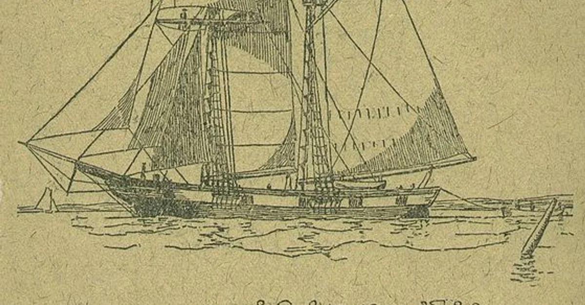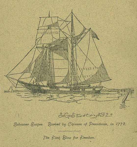 HMS Gaspee, a Royal Navy schooner that was seized and burned by American colonists on 10 June 1772, in the leadup to the American Revolutionary War (1775-1783), a 19th-century sketch by S. G. Studley, 1892.