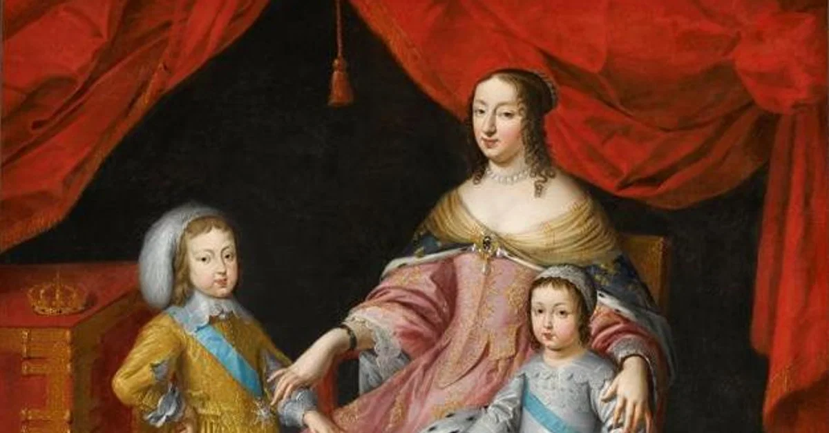 Anne of Austria (l. 1601-1666) with her two sons Louis XIV of France (r. 1643-1715) and Philippe, Duke of Orléans (l. 1640-1701), oil on canvas by an unknown artist, between 1641-1650.