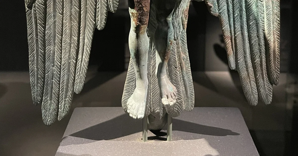A three-nozzled bronze lamp featuring the god Zeus in the form of an eagle, carrying the boy Ganymede off to Mount Olympus to be his cupbearer. When the lamp was lit, the beautiful youth would gleam, and the divine bird would be encircled by a glowing nimbus. Possibly Greek, from Asia Minor (modern-day Turkey), dated to 250-100 BCE.