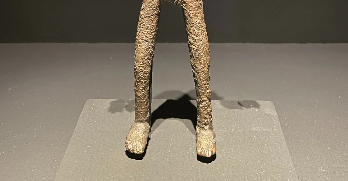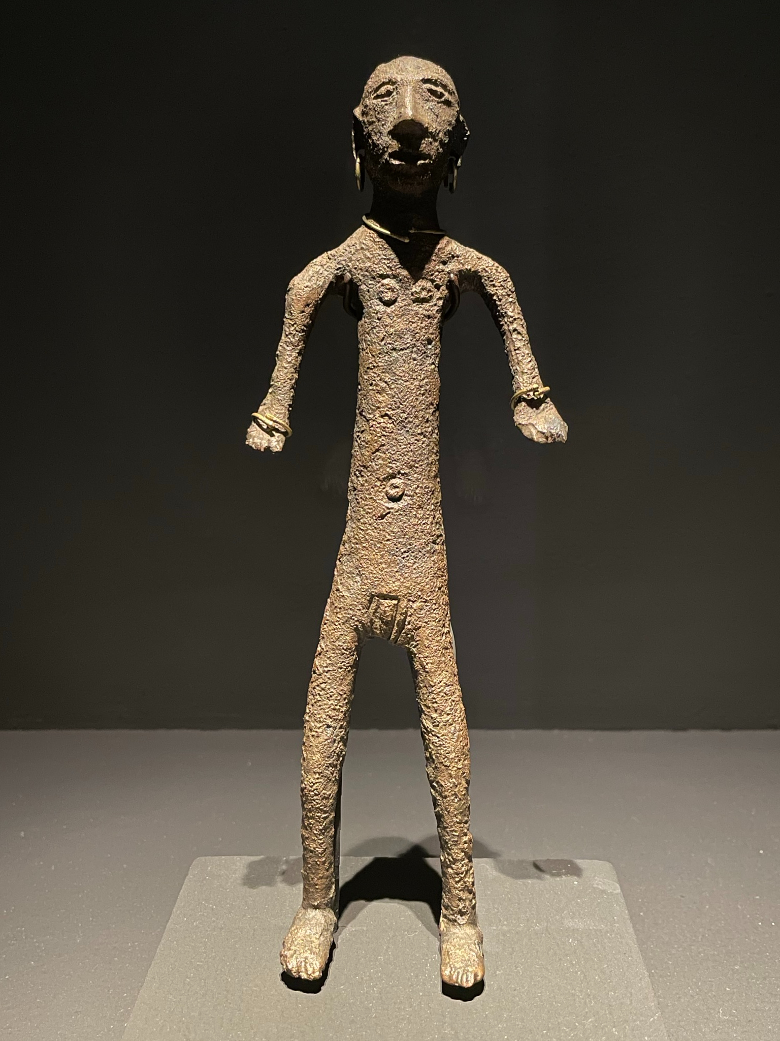 Adorned with gold jewellery (torque, bracelets, and earrings), this figure was carefully buried in a way that seems to mimic the human burials at the site. A total of seven metal figurines were discovered at Vani. Their precise function remains unclear, but they were probably related to local religious and funerary customs.