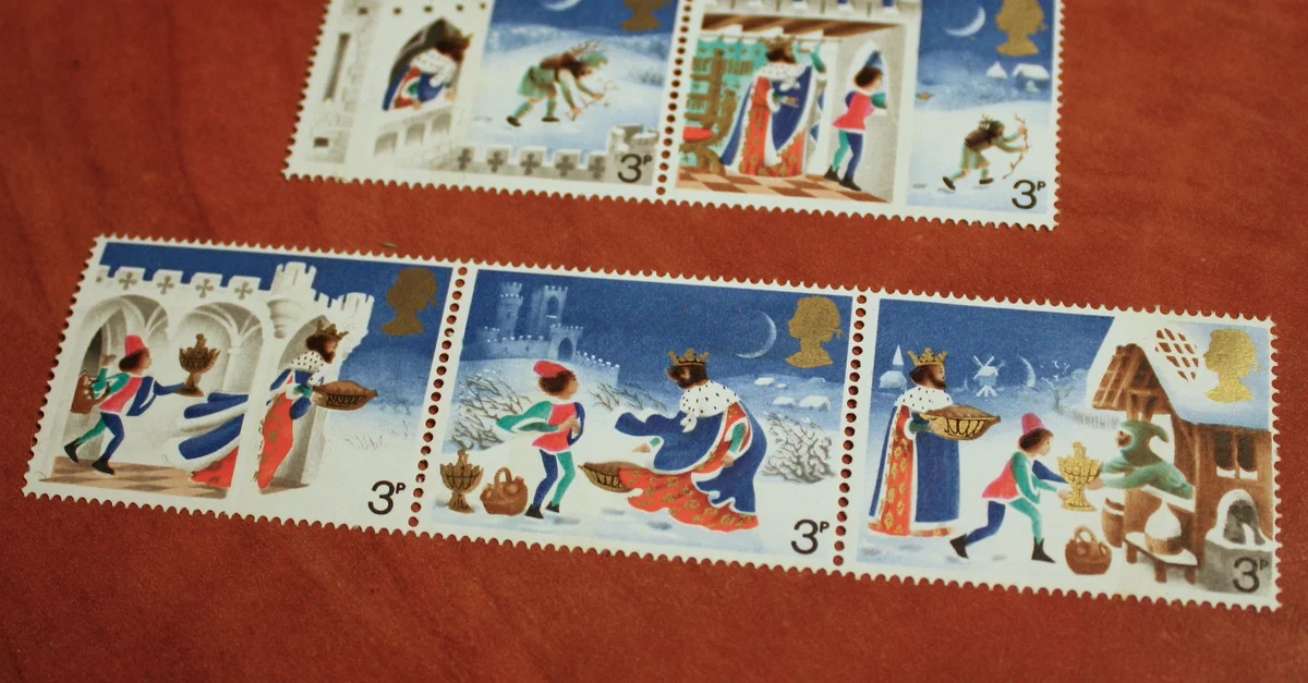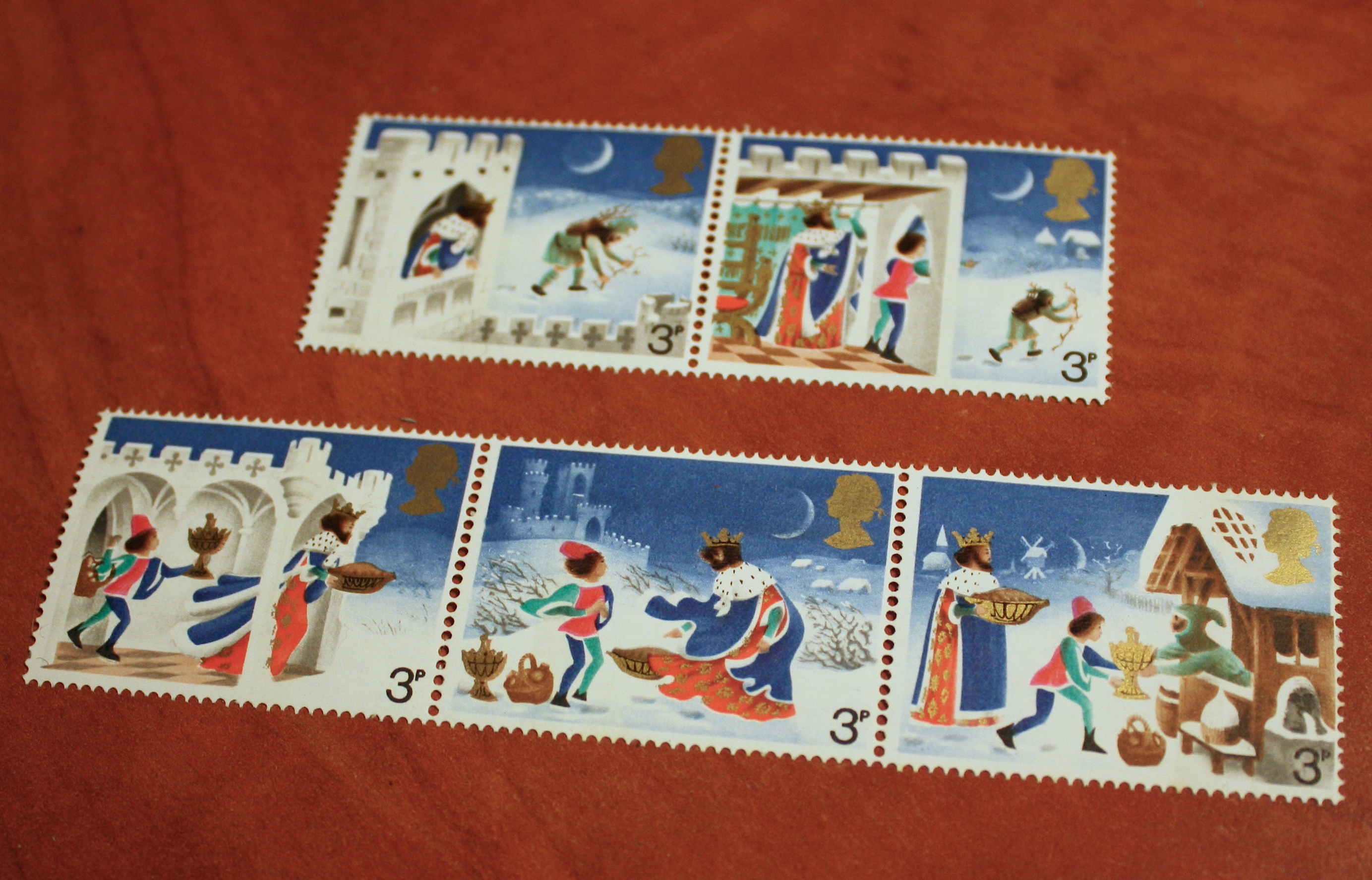 A series of British postage stamps showing the story of Good King Wenceslas as he appears in the Christmas carol of that name. Issued in November 1973.
