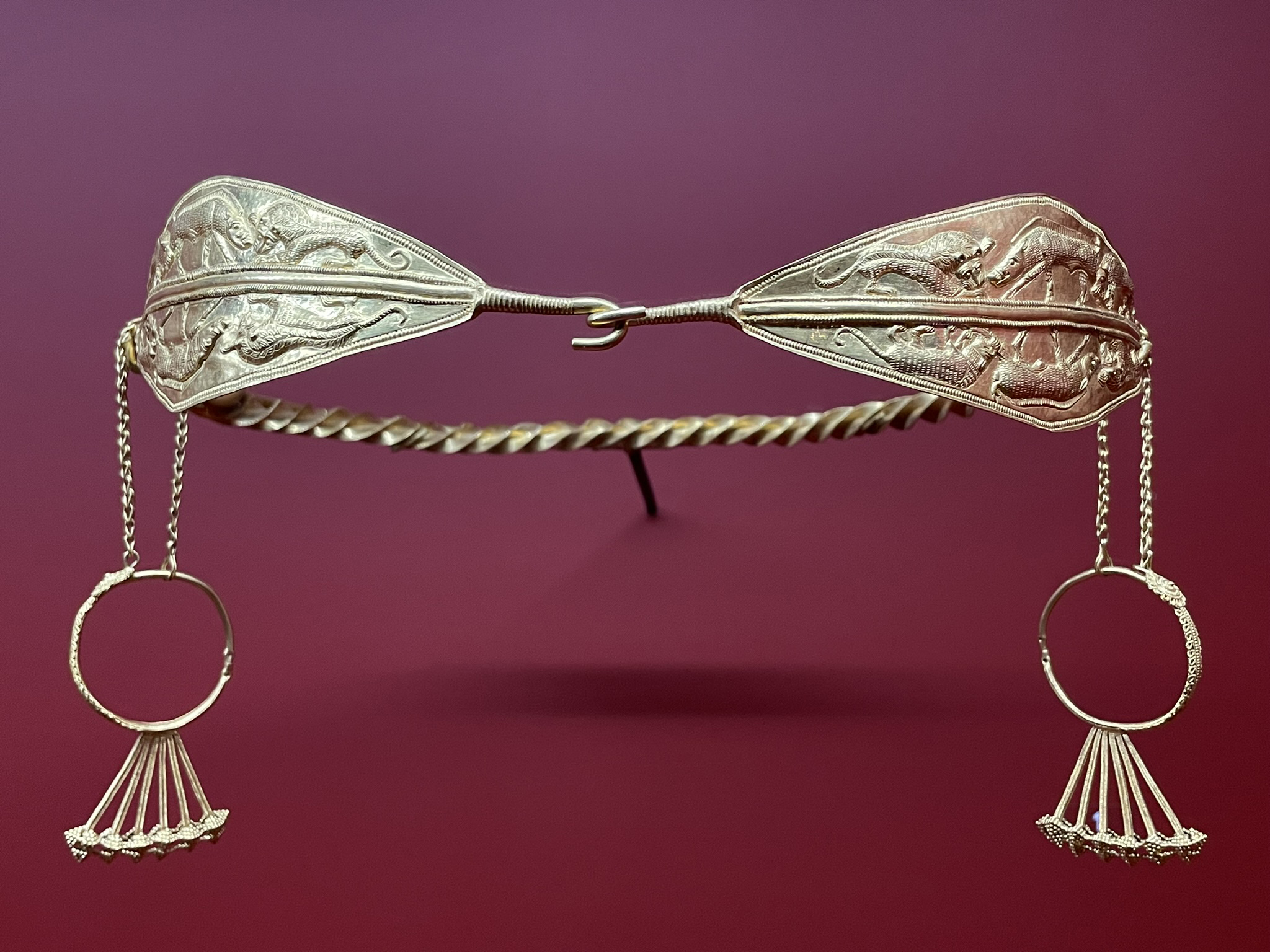 Gold diadem with temple rings featuring lions attacking a wild boar. From Vani (grave 6), an archaeological site from Colchis located in the Imereti region of Georgia. Dated to the first half of the 4th century BCE.