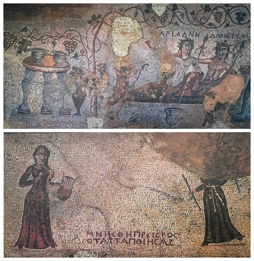 The upper mosaic is devoted to the cult of Dionysus, the god of wine. It depicts a figural scene with Dionysus and Ariadne seated on a couch under a vine pergola, with Greek inscriptions revealing their names.