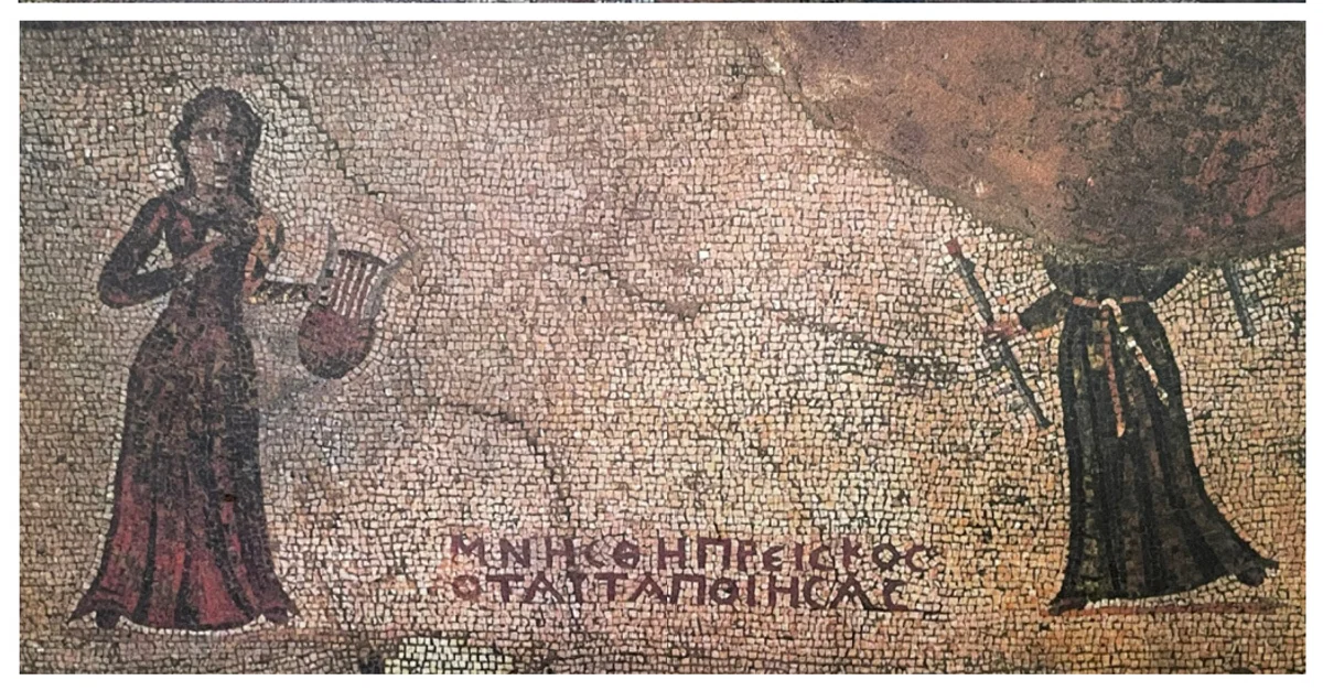 The lower mosaic shows two female figures clad in long garments, holding musical instruments, a lyre and an aulos. They are probably Euterpe, the Muse of Music and Poetry, and Terpsichore, the Muse of Dance. The Greek inscription says: 'Preiskos made this'.