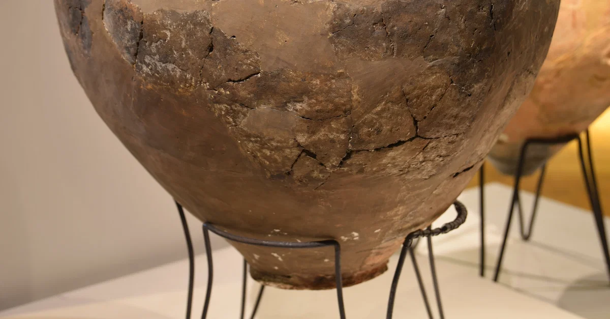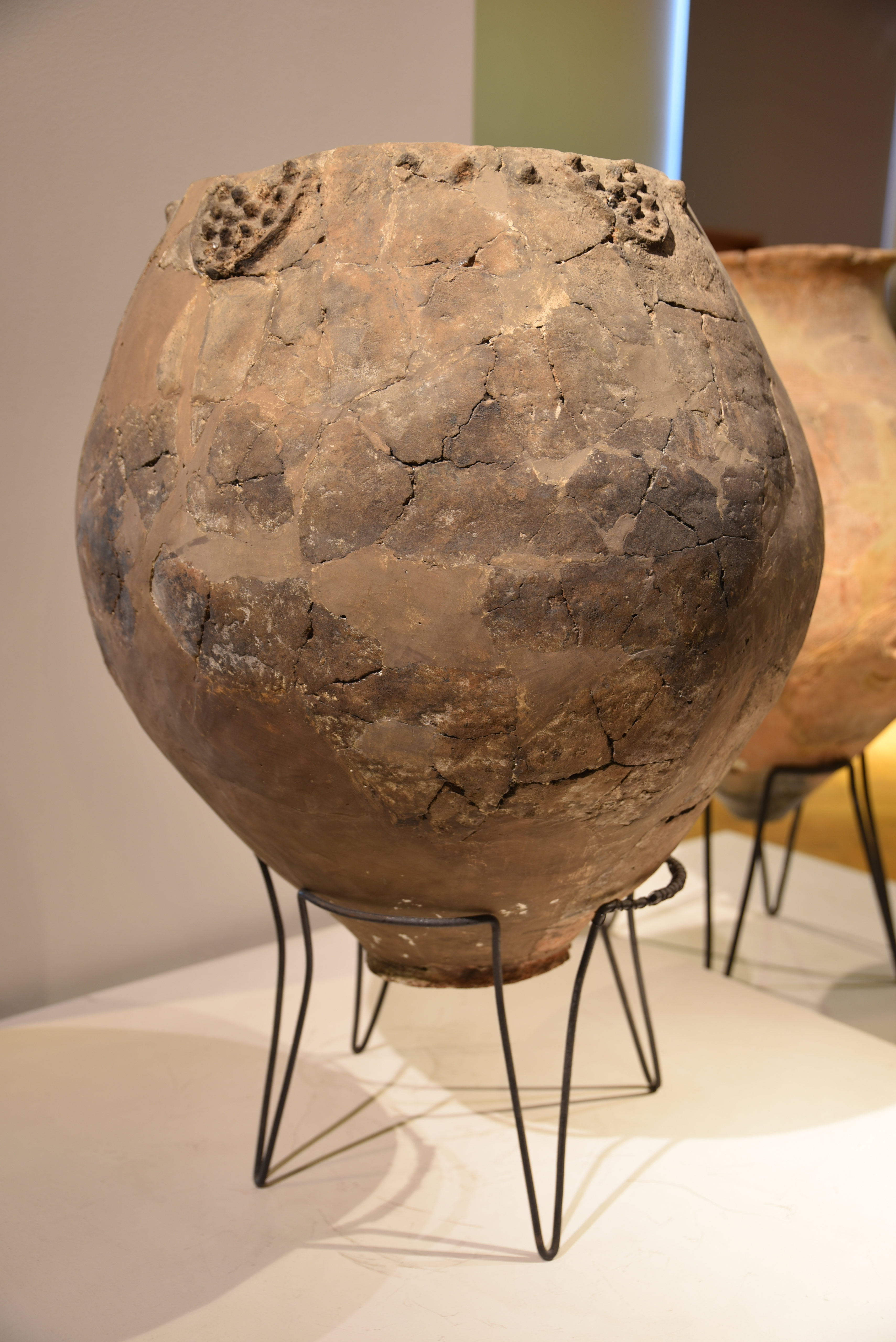 Terracotta wine jar, known as qvevri, with a capacity of approximately 100 litres (26 gal), the earliest Neolithic evidence for the beginnings of a wine culture in which wine dominated social and economic life has been found in the Republic of Georgia. Found at the site of Khramis Didi Gora in southeastern Georgia, dated to the first half of the 6th millennium BCE.