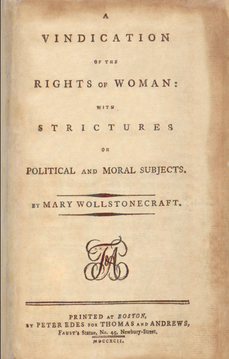 The title page of A Vindication of the Rights of Women by Mary Wollstonecraft (1759-1797). The book, first published in 1792, called for greater educational opportunities for women and equality with men. (Library of Congress)