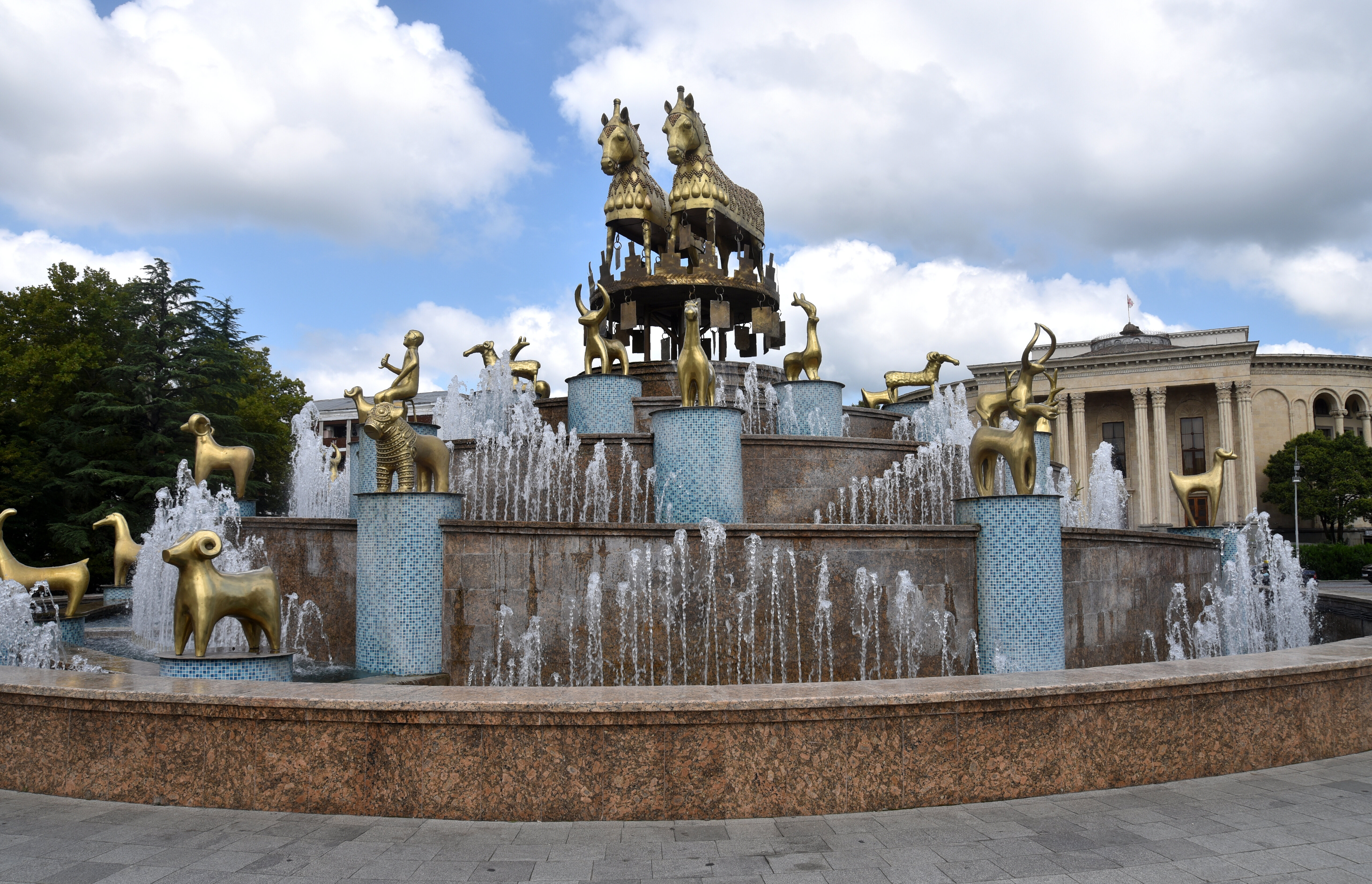 The Colchis Fountain is a monument in the central square of Kutaisi in Georgia that celebrates the ancient kingdom of Colchis. It is adorned with 30 large-scale copies of the famous gold jewellery discovered at archaeological sites in Georgia, including the nearby Vani. The fountain was created by Georgian architect David Gogichaishvili and opened in May 2012.