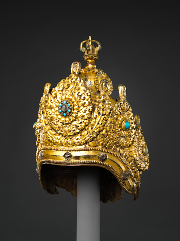 A gilded and turquoise Vajracharya Priest’s Crown from Nepal. Vajracharya was the highest rank of priesthood. Made in 1717. Height: 12 in. (30.5 cm). Width: 7 1/2 in. (19.1 cm). The inscription includes a warning for those who covet the crown. (Metropolitan Museum of Art, New York)