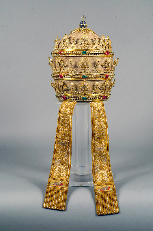 The tiara of Pope Pius IX (in office 1846-1878). Made in 1854. Made of a trio of gold crowns set with diamonds, emeralds, sapphires, pearls, and other jewels around a silver-thread fabric. It measures 35 cm (13.7 in) in height and diameter: 24 cm (9.4 in) in diameter. (https://theme.npm.edu.tw/exh105/artifacts/en/page-5.html)
