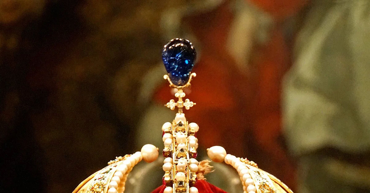 The Imperial Crown of Austria. Made in 1602, this crown has been used by the Habsburg monarchs of Austria, the Holy Roman Empire, and the Austro-Hungarian Empire, and the kings of Hungary and Bohemia. The crown combines the traditional crown form of secular rulers with the mitre form of religious leaders. It is embedded with diamonds, precious stones, and pearls. The large stone at the very top is a blue-green emerald. (Imperial Treasury, Vienna)