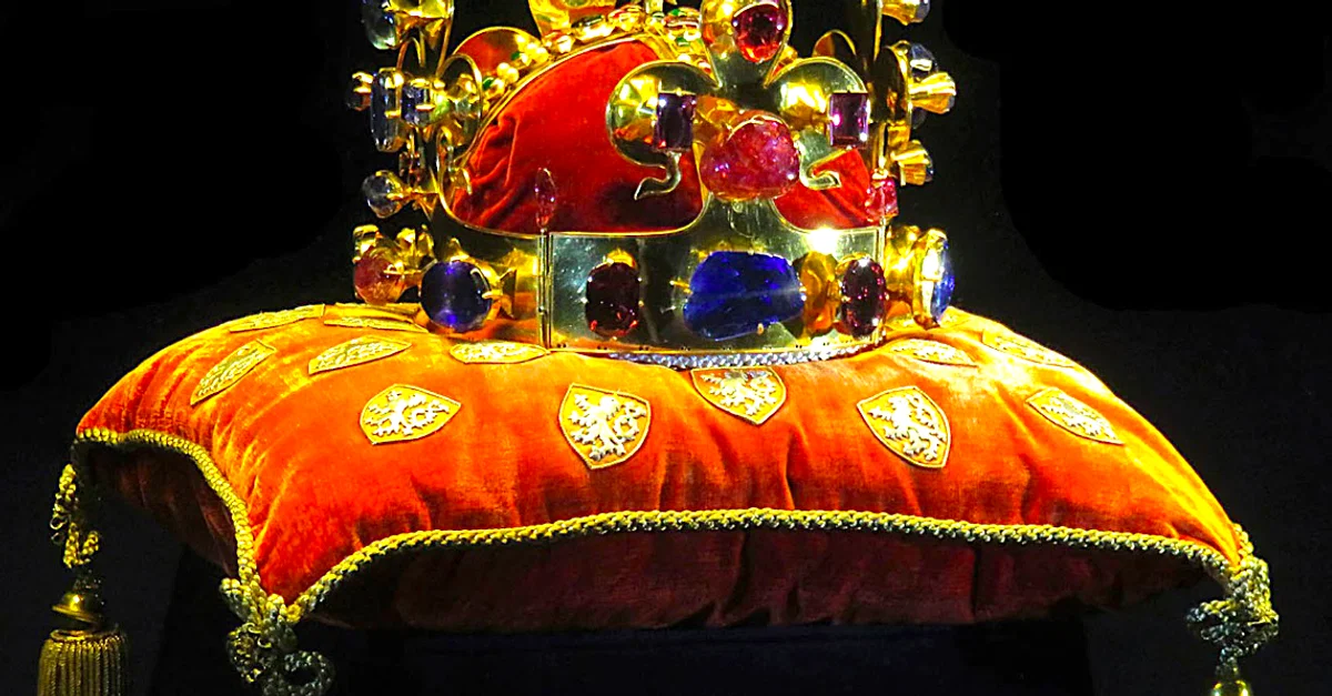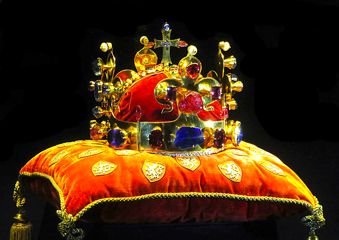 A replica of the Crown of Saint Wenceslaus. The Bohemian Duke Wenceslaus I (r. 921-935) was given the honorary title of king by Otto I, Holy Roman Emperor (r. 962-973) and made a saint. This crown was made in his honour in the mid-14th century for the coronation of Charles IV, King of Bohemia and Holy Roman Emperor (l. 1316-1378). Made of gold with sapphires, emeralds, pearls, and other precious stones. The orginal crown is not on public display and is kept in St. Vitus Cathedral, Prague.