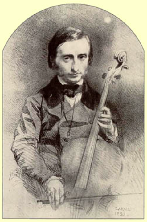 An illustrated portrait of a young Jacques Offenbach (1819-1880) playing the cello. Made in 1850.