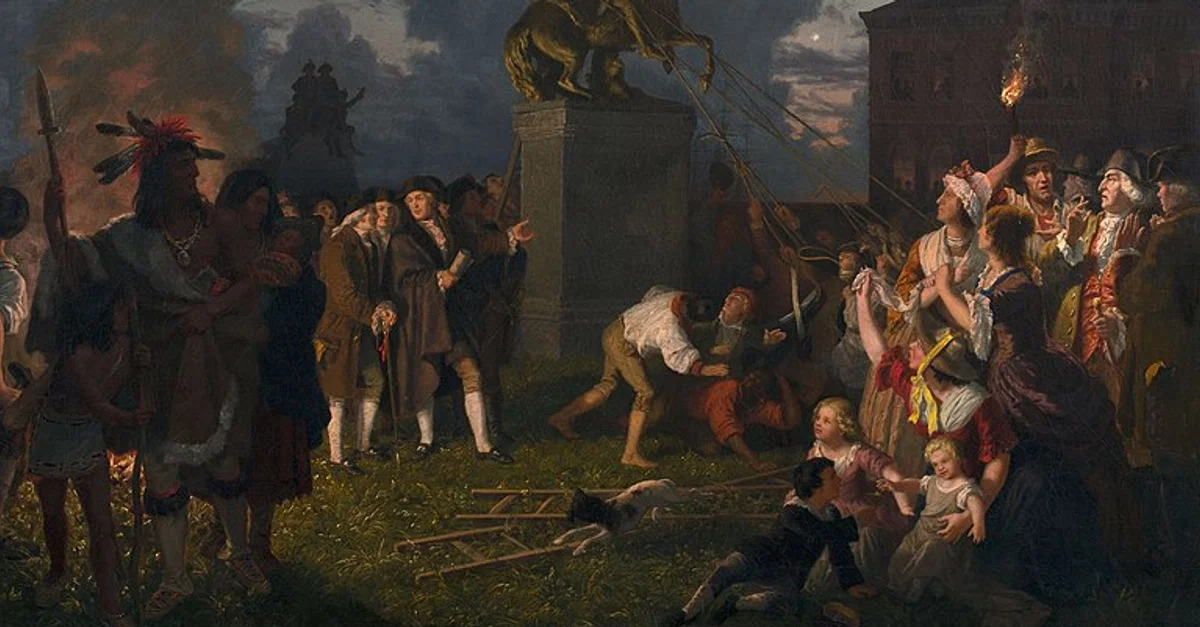 On 9 July 1776, American Patriots and Sons of Liberty pull down the statue of King George III of Great Britain in New York City, shortly after George Washington read the United States Declaration of Independence. Two months later, the British would take control of the city following the American defeat at the Battle of Long Island.