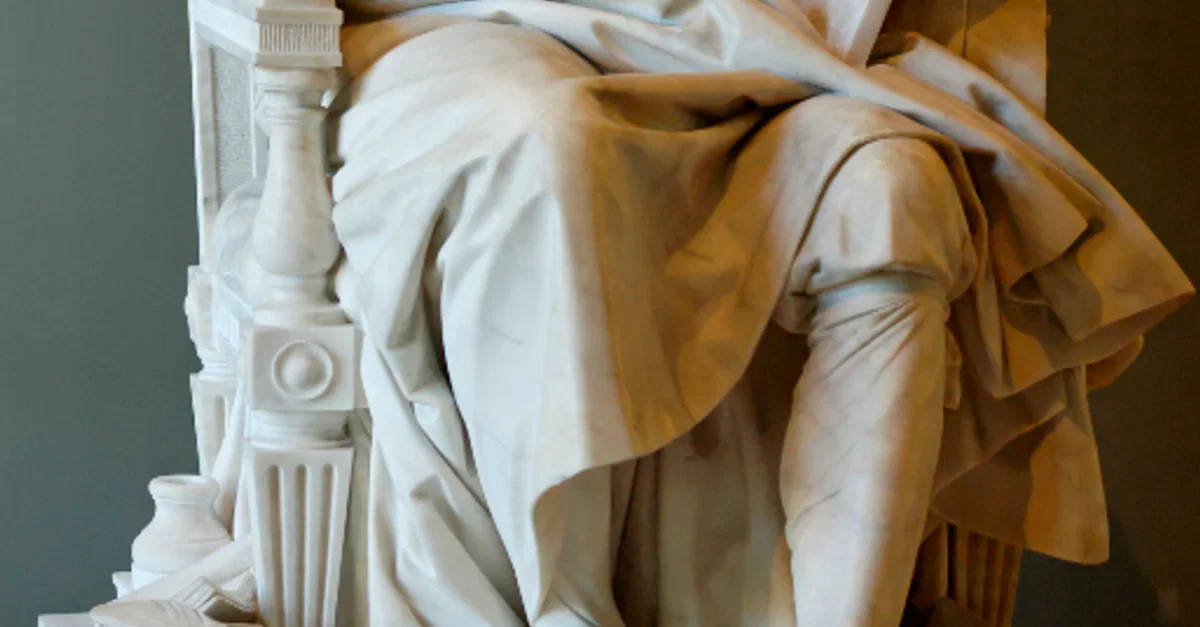 A c. 1780 statue by Augustin Pajou of Blaise Pascal (1623-1662), the French scientist, mathematician, and philosopher. Pascal is shown contemplating a mathematical problem involving the cycloid. (Louvre, Paris)