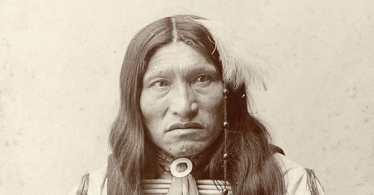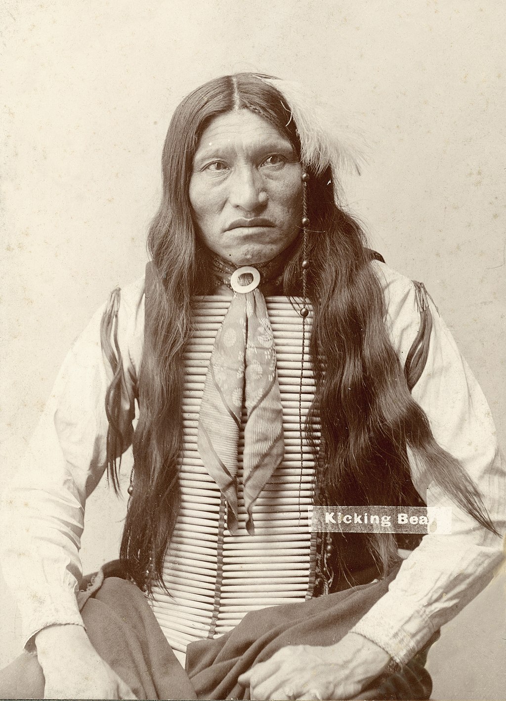 Chief Kicking Bear (l. 1845-1904) of the Oglala Lakota Sioux Nation in 1891; photo taken while he was a prisoner at Fort Sheridan, Illinois. Kicking Bear is credited by some scholars with creating the ghost shirt used during the Ghost Dance 1889-1890.