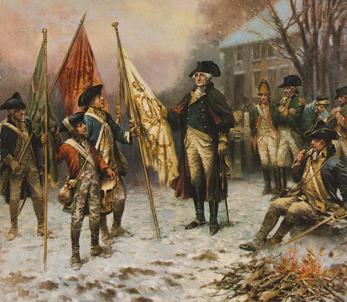 George Washington inspects the colors captured from the Hessians following the Battle of Trenton (26 December 1776). Reproduction of a painting of Edward Percy Moran, lithograph by Hayes Litho. Co. Buffalo, N.Y., August 1914.