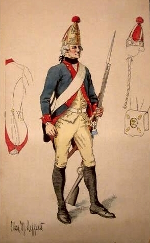 Hessian grenadier from Colonel Johann Rall's regiment during the American Revolutionary War. This uniform is what the Hessians would have worn around the time of the Battle of Trenton (26 December 1776). Watercolor By Charles M. Lefferts, c. 1910.
