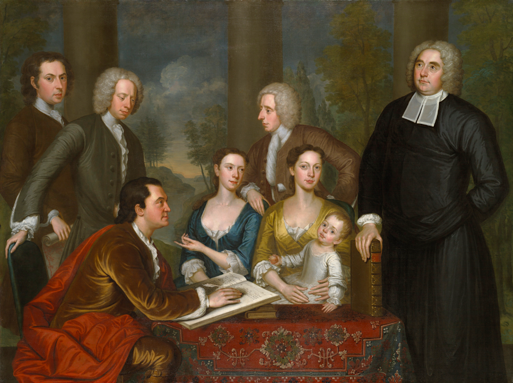 A c. 1730 oil-on-canvas painting, the Bermuda Group, by John Smibert. Shown standing on the far right of the picture is the Anglo-Irish philosopher George Berkeley (1685-1753) who tried to assemble funding for new educational institutions for Bermuda. (Yale University Art Gallery)