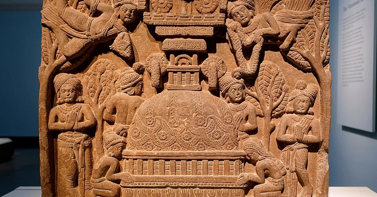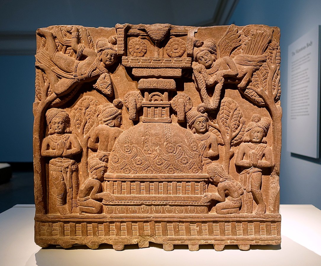 Worship at a stupa, sandstone fence-rail from the Bharhut Stupa, Bharhut, Madhya Pradesh, India, early 2nd century BCE.