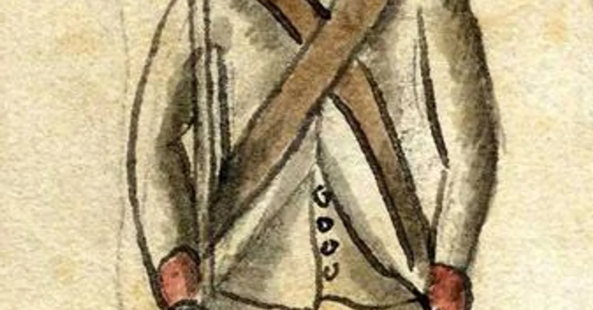 A cropped image of a Black infantryman from the 1st Rhode Island Regiment during the American Revolutionary War (1775-1783); the full watercolor shows American troops at the Siege of Yorktown, 1781. By Jean Baptiste Antoine de Verger, 1781.