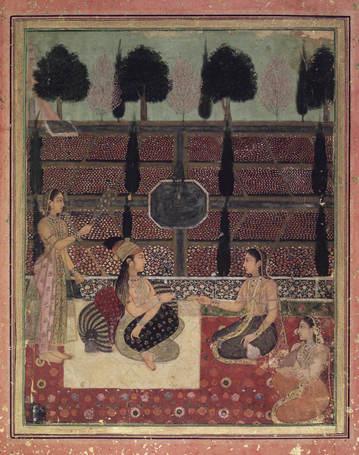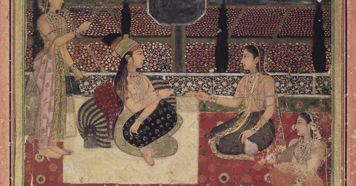 Idealized image of the Mughal zenana, opaque watercolor on paper by an unknown artist, Mughal India, c. 1700-1710.