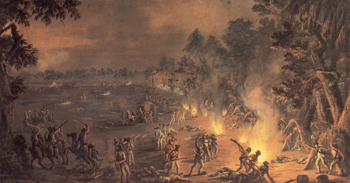 A depiction of the Battle of Paoli (known to the Americans as the Paoli Massacre) when, on the night of 20 September 1777, a party of British soldiers launched a surprise attack on an American encampment. By Xavier della Gatta, 1782.