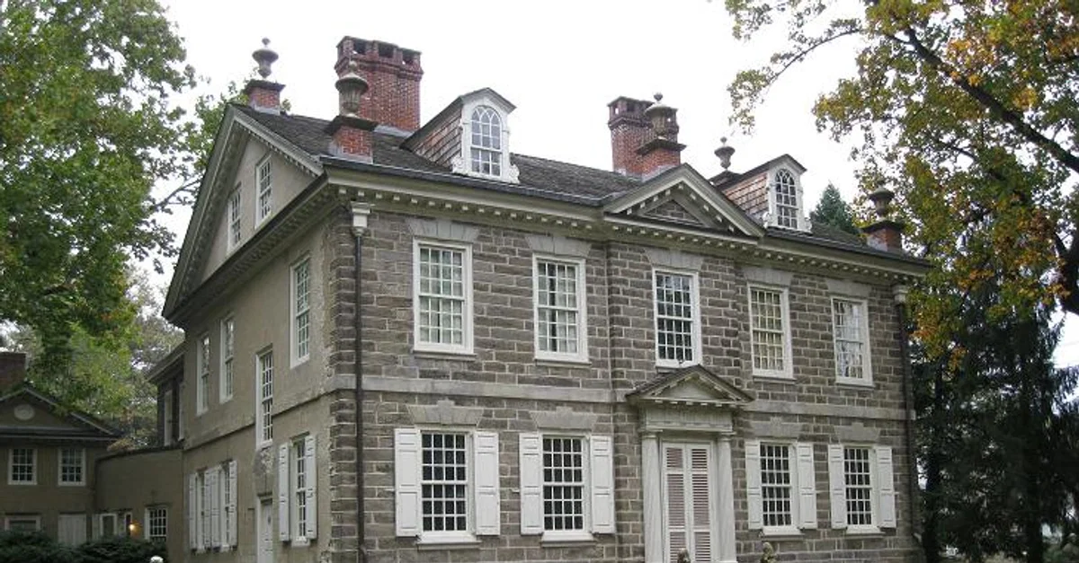 A front view of Cliveden (or the Chew House) in which 120 British soldiers barricaded themselves during the Battle of Germantown (4 October 1777), slowing the American attack. Photo by Wikipedia user Djmaschek, 14 October 2011.