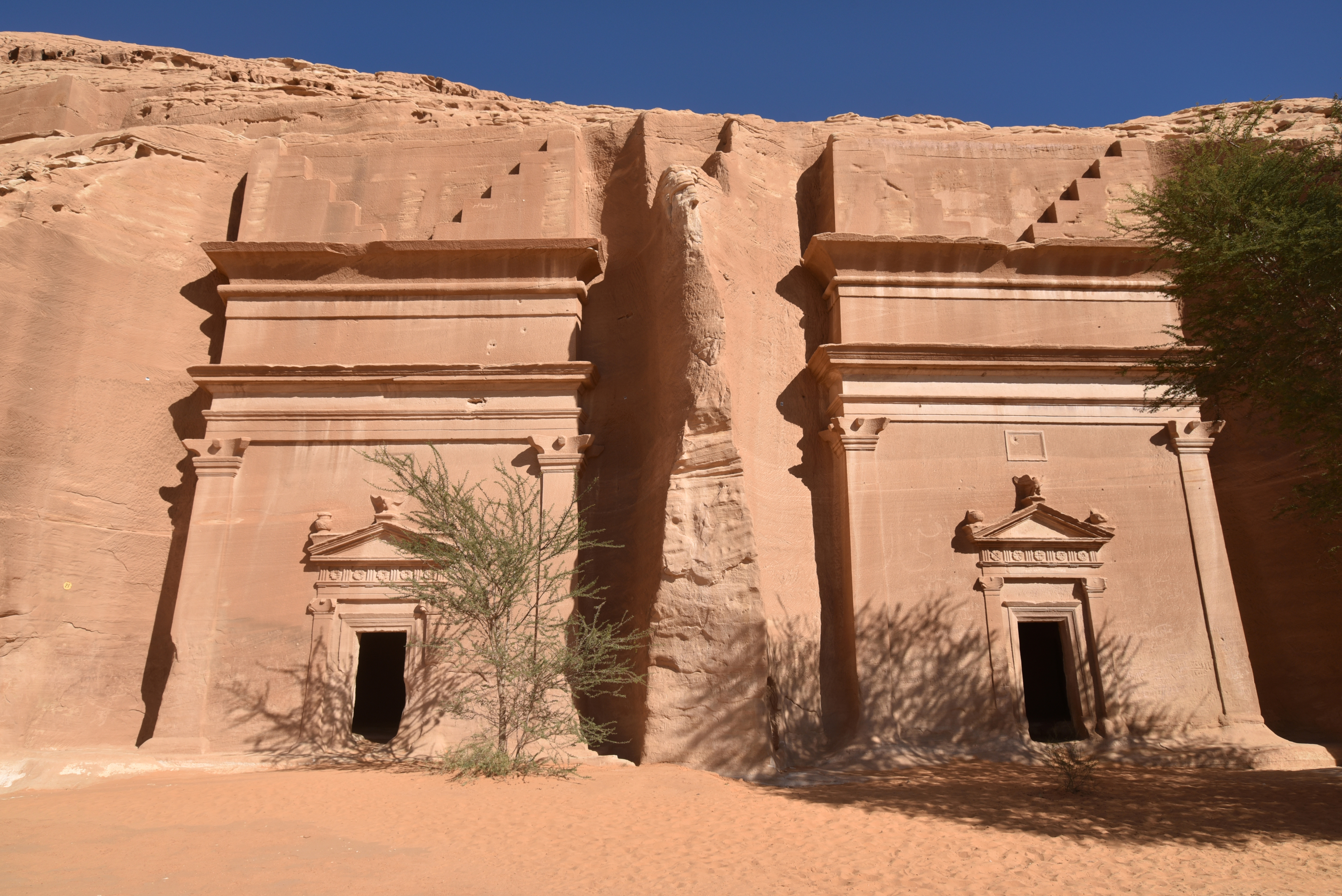 Two tomb façades in Qasr al-Bint (Tombs 21 & 22), one of the necropolises of Hegra (Mada'in Salih) in modern-day Saudi Arabia. Tomb 22 (right) is the oldest dated façade in Hegra (along with Tomb 39). It was carved in 1 BCE, the 9th year of the reign of King Aretas IV Philopatris. The Nabataean inscription above the doorway also states that it was carved for Aydu ibn Kuhayl and his descendants and that the deities Dushara, Manat and Qaysha protect this tomb.