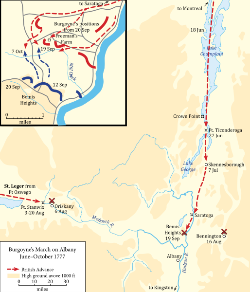 A map depicting the progress of Burgoyne's and St. Leger's armies during the Saratoga Campaign (20 June to 17 October 1777). Created by Wikipedia user Hoodinski, 21 December 2014.