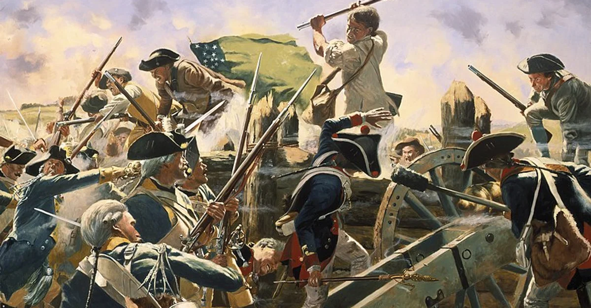 Patriot militia under General John Stark attacks the German (Hessian) positions during the Battle of Bennington (15 August 1777), one of the major engagements of the Saratoga Campaign. Painting by Don Troiani, March 2004.