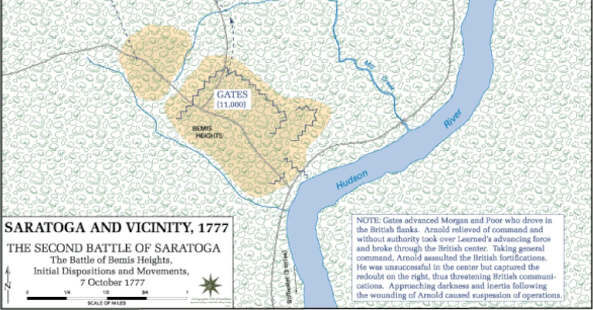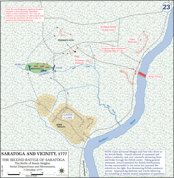 Troop movements at the Second Battle of Saratoga (or Battle of Bemis Heights), 7 October 1777. Map by the History Department of the United States Military Academy.