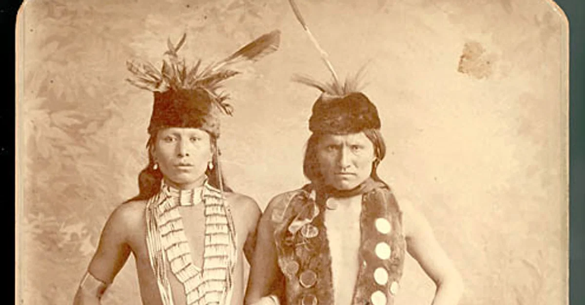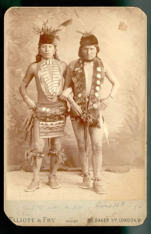 Oglala Lakota Sioux nation citizens Black Elk & Elk in costume as grass dancers while performing with the Buffalo Bill Wild West Show in London, England, 1887.