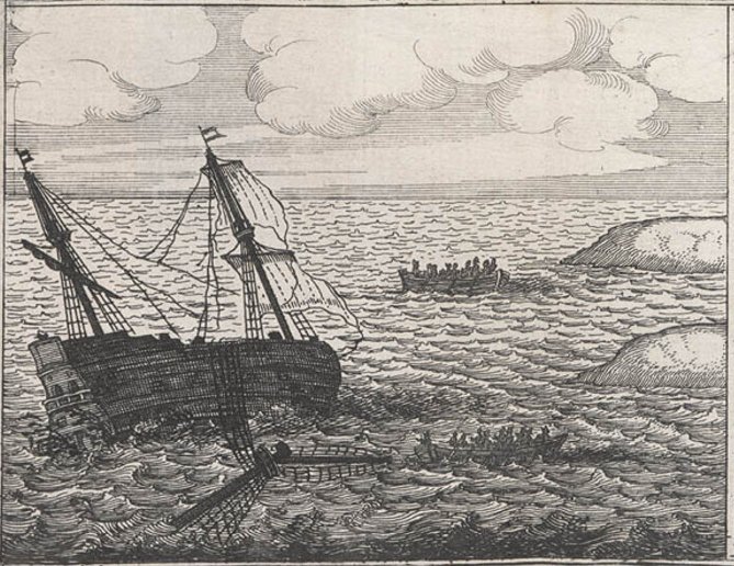 Survivors being transferred from the wrecked Batavia to nearby islands in the ship's boats. Plate 1, from Ongeluckige voyagie, van 't schip Batavia, nae de Oost-Indien, by F. Pelsaert, F., & Vliet, J., 1647.