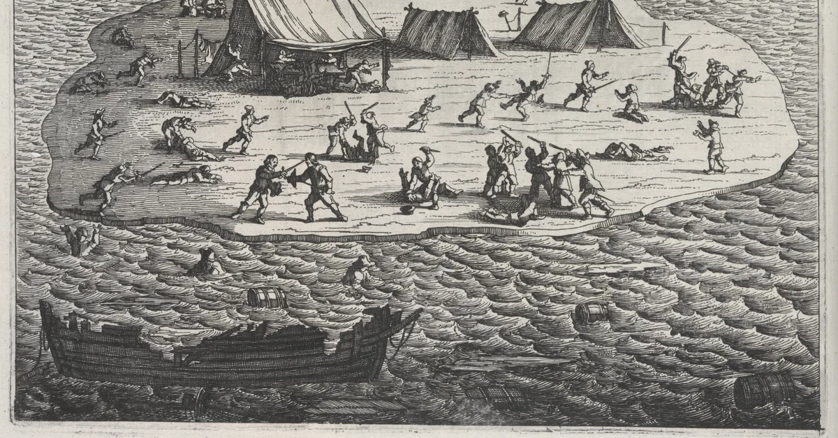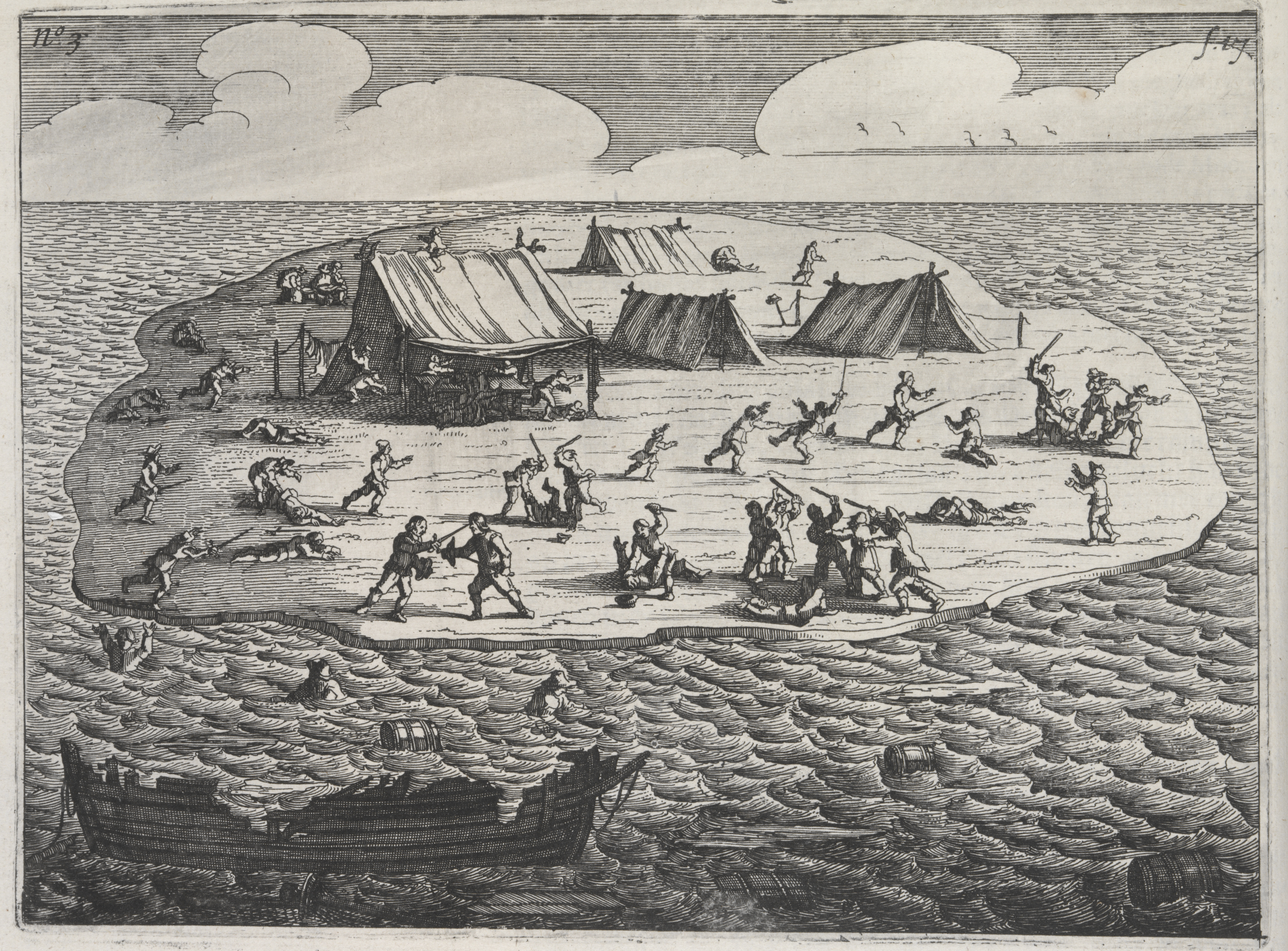 Massacre of the survivors after the shipwreck of the Batavia, a Dutch East India Company vessel that was wrecked off the Western Australia coast in 1629. Plate 3, from Ongeluckige voyagie, van 't schip Batavia, nae de Oost-Indien, by F. Pelsaert, F., & Vliet, J., 1647.