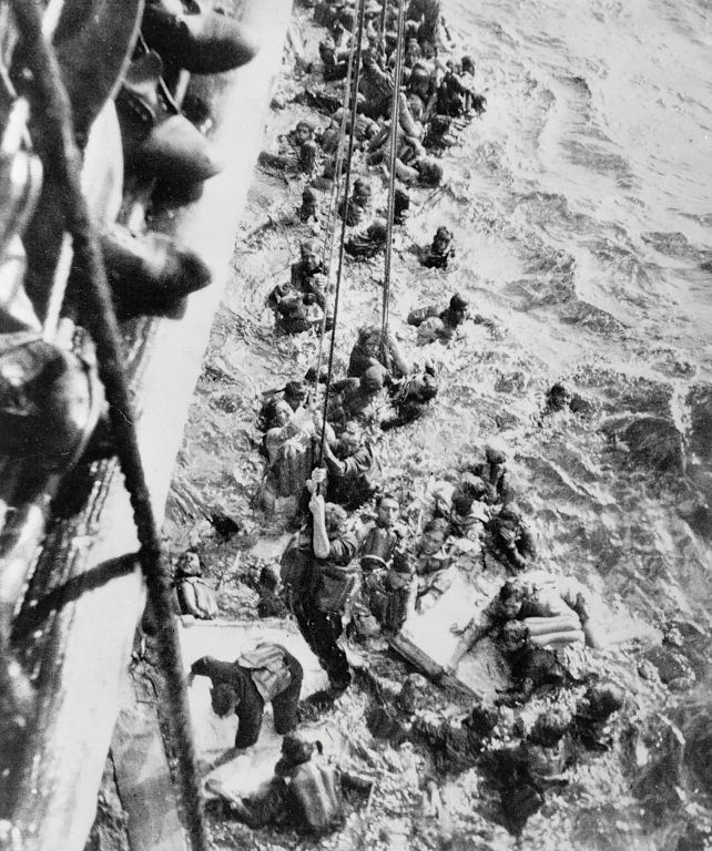A photograph of HMS Dorsetshire picking up survivors after the sinking of the German battleship Bismarck in May 1941 in the Atlantic. Only 110 men survived from a crew of over 2,000. (Imperial War Museums, London)
