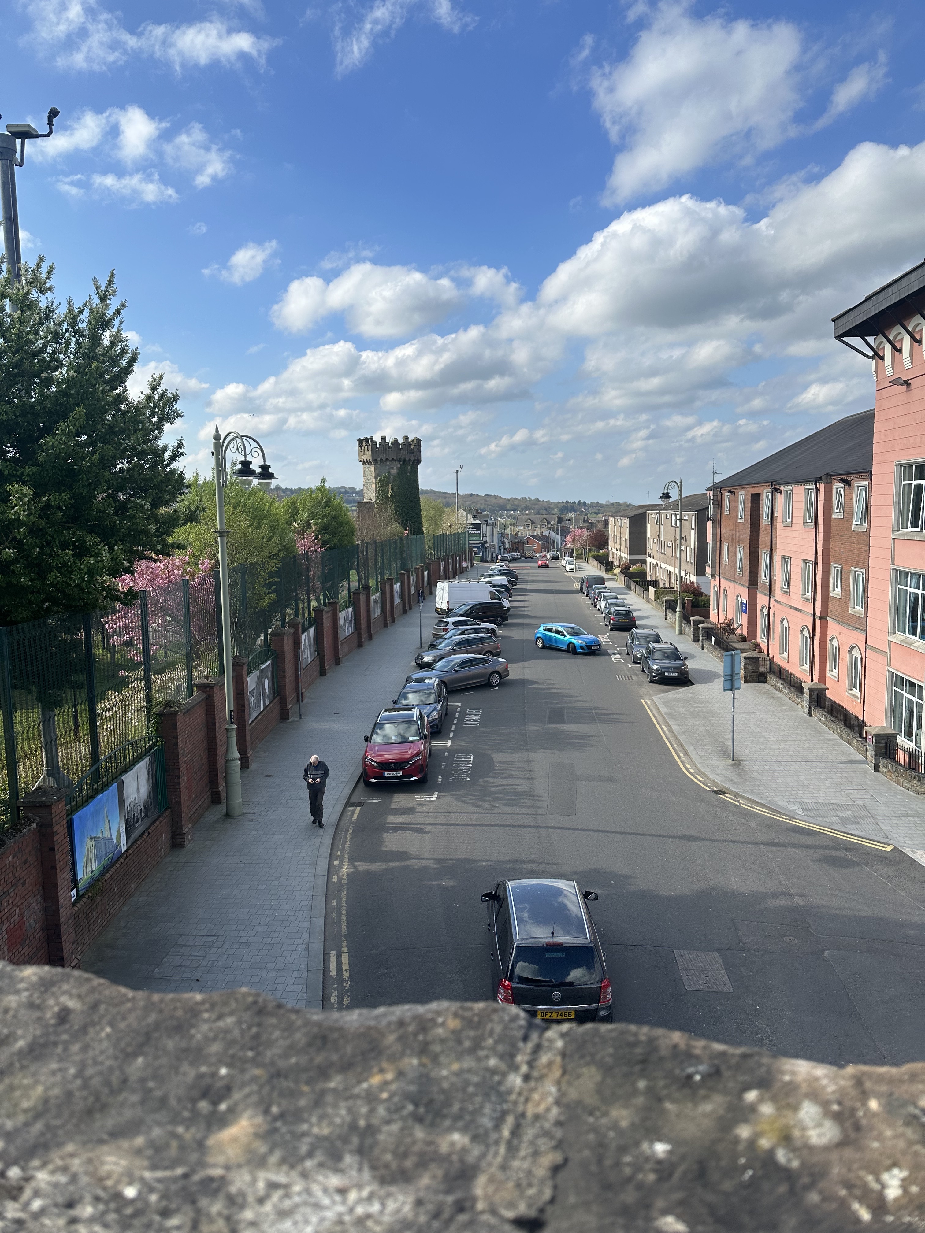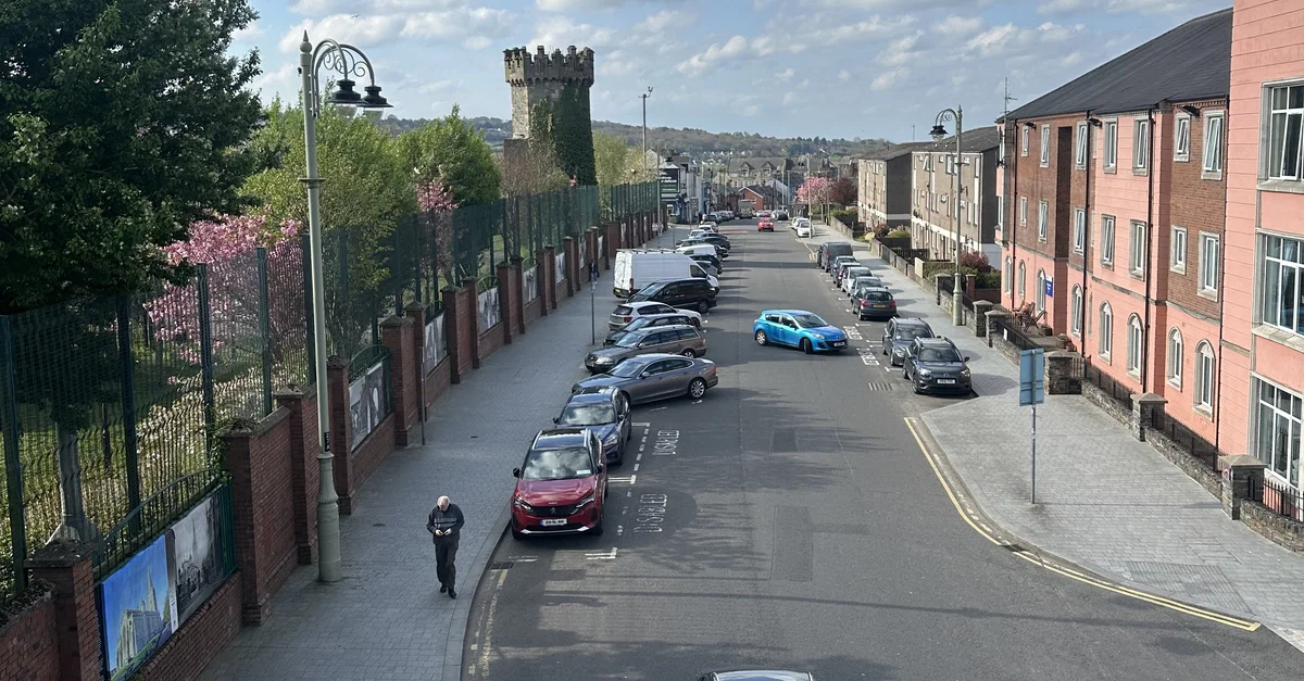 Bishop Street in Derry, Northern Ireland, with its "peace wall" running along the left side of the photograph. Peace walls are erected in Northern Ireland to separate predominantly Catholic and Protestant communities.