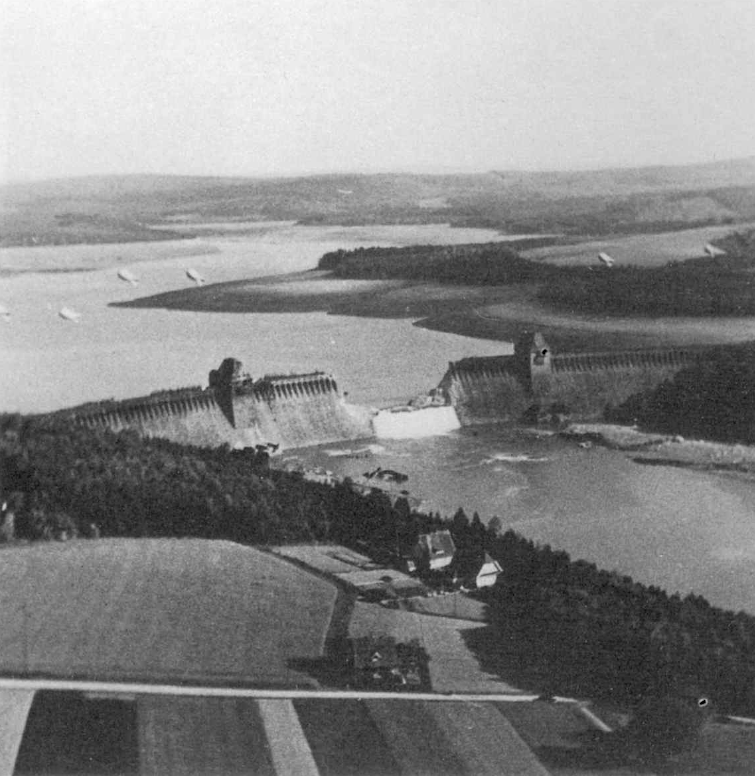 The breached Möhne dam in the Ruhr basin, Germany, after Operation Chastise of the night of 16 May 1943. The operation, also known as the 'Dam Busters' Raid, was carried out by a squadron of British RAF Lancaster bombers using a special bouncing bomb. This photograph was taken the day after the raid which flooded the heavy industry in the valley below.